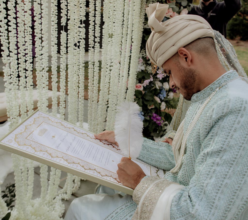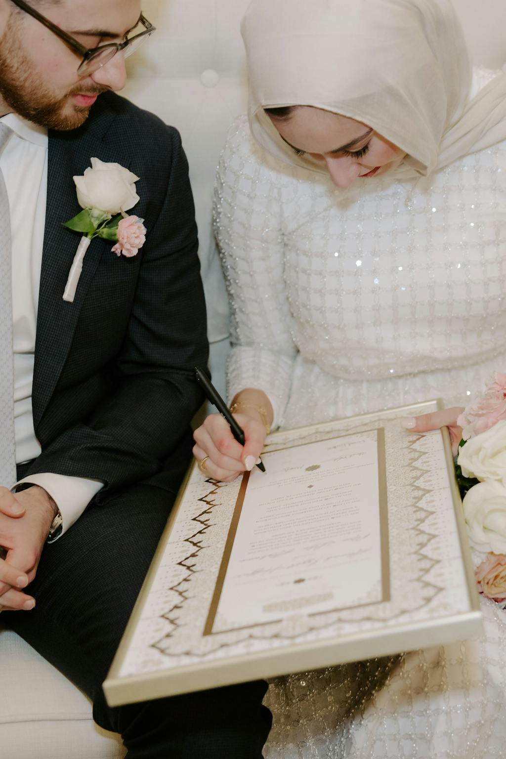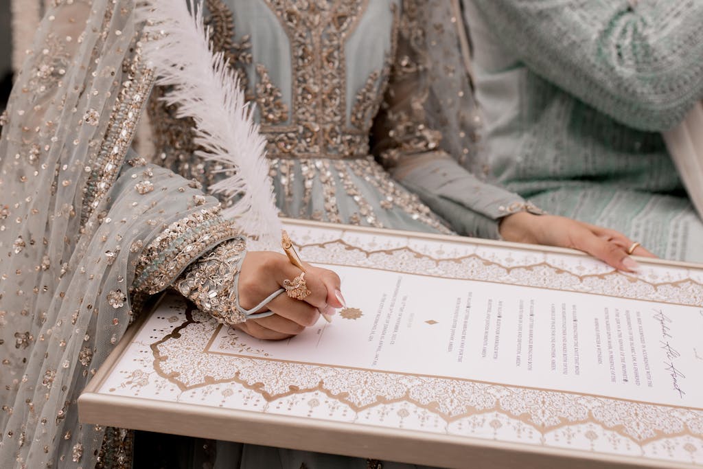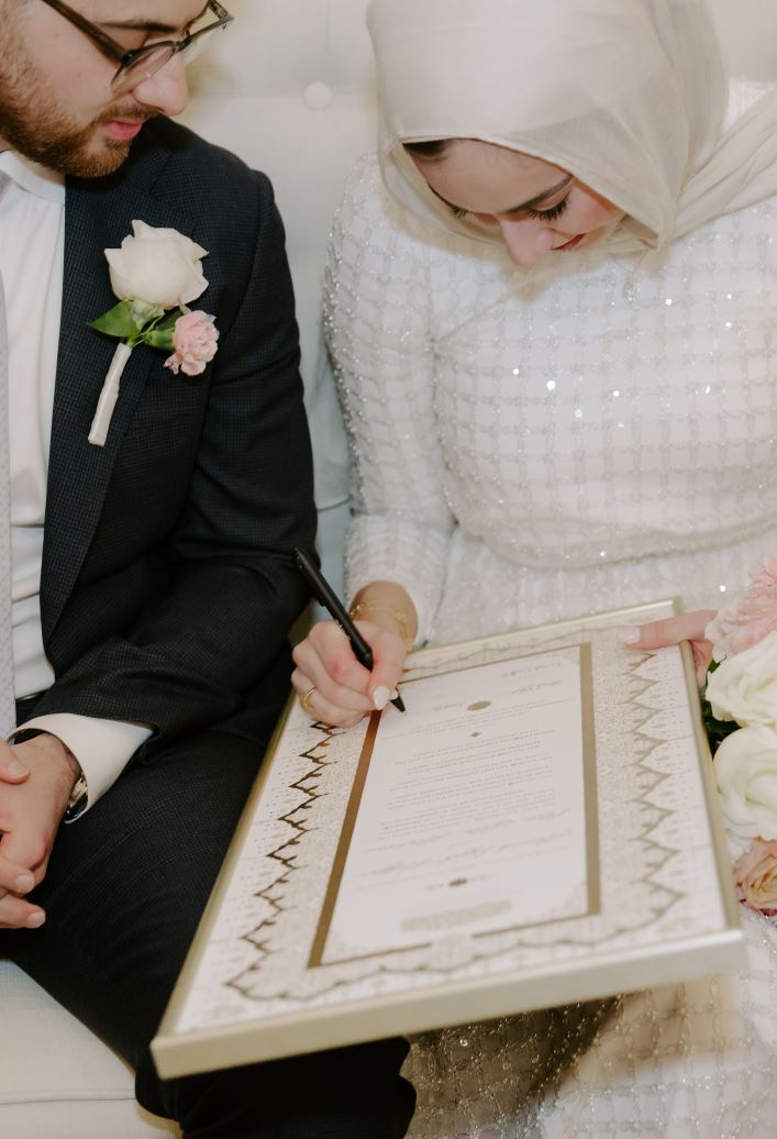 Bring your nikah certificate to the religious ceremony, along with any required government documents, and present it to your officiant. The signing happens during the nikah or katb al-kitab, where all documents are signed at once. While some cultures treat the nikah ceremony like an engagement event, once the nikah is complete, the marriage becomes valid in Islam.