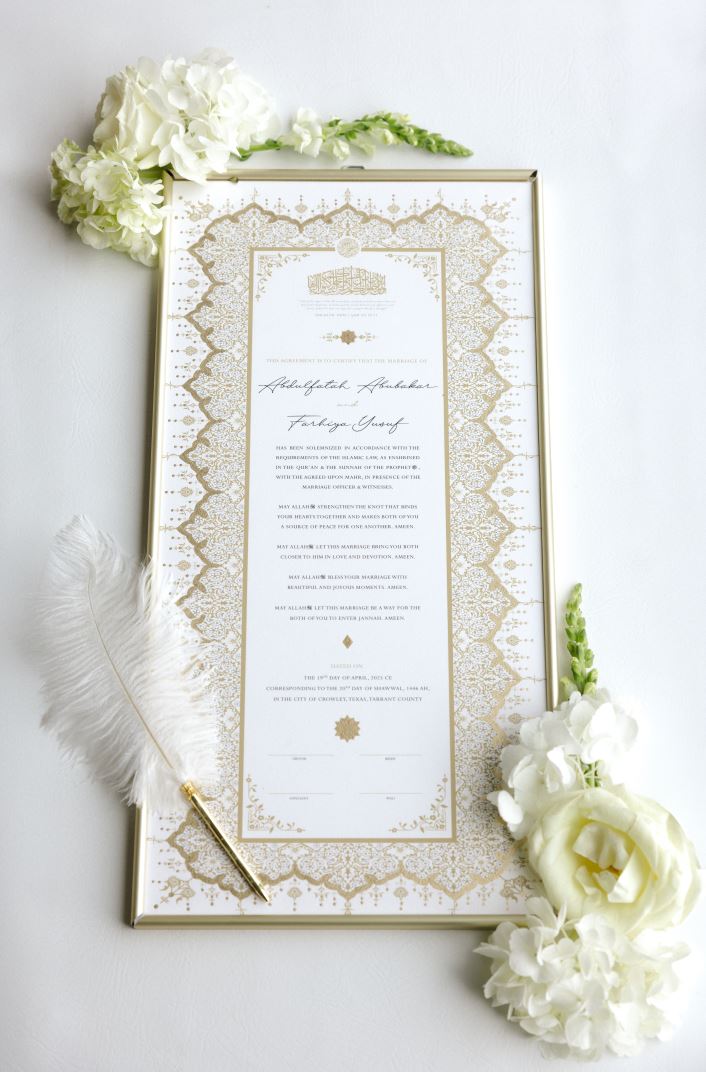 Bundles include your hand embellished nikah contract, frame, and feather pen.