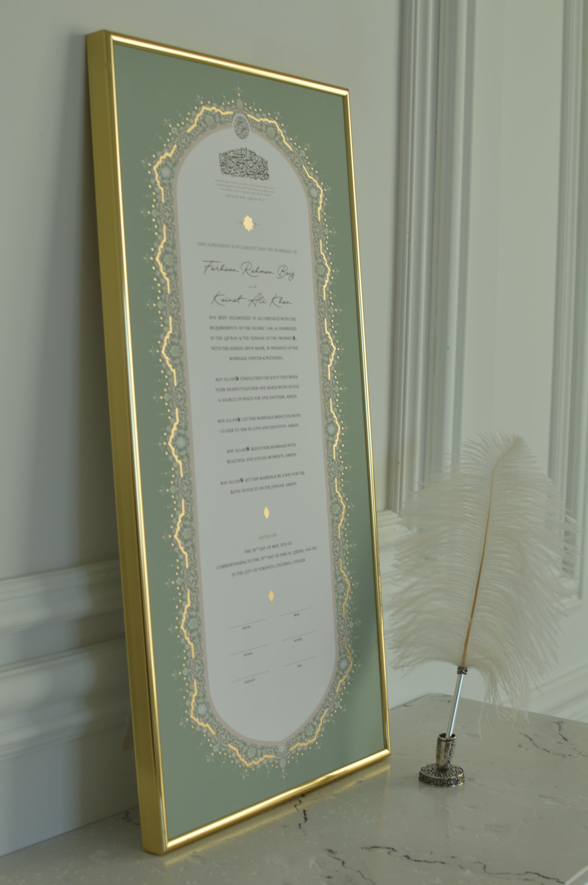 BUNDLE: Raeesa Sage Nikah Certificate Gold Embellishment + Frame + Pen