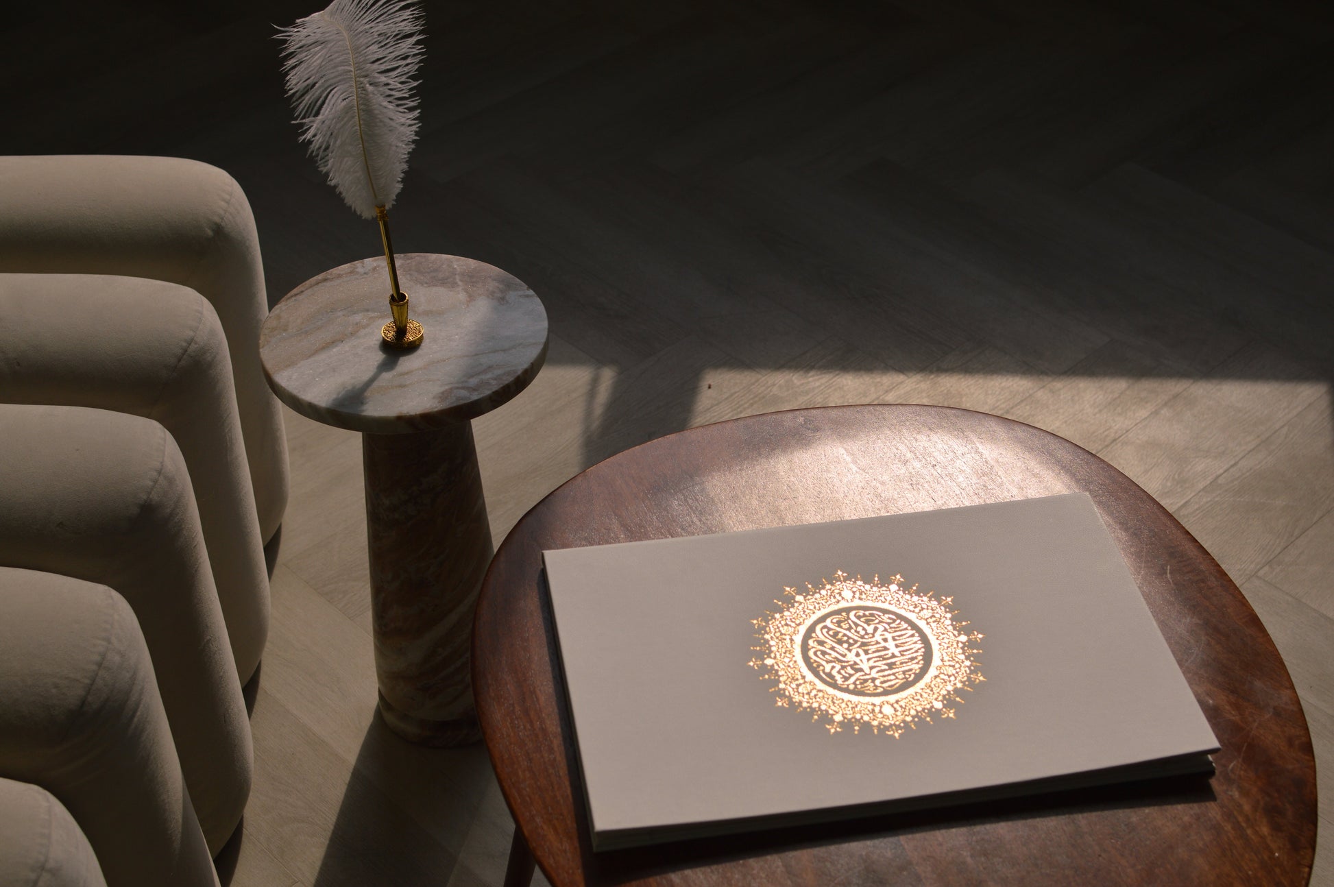 The couple’s crest is a unique emblem exclusive to Raeesa Studio nikah certificates and wedding products. Our calligrapher will create a beautiful crest featuring the groom and bride's first names in Arabic.