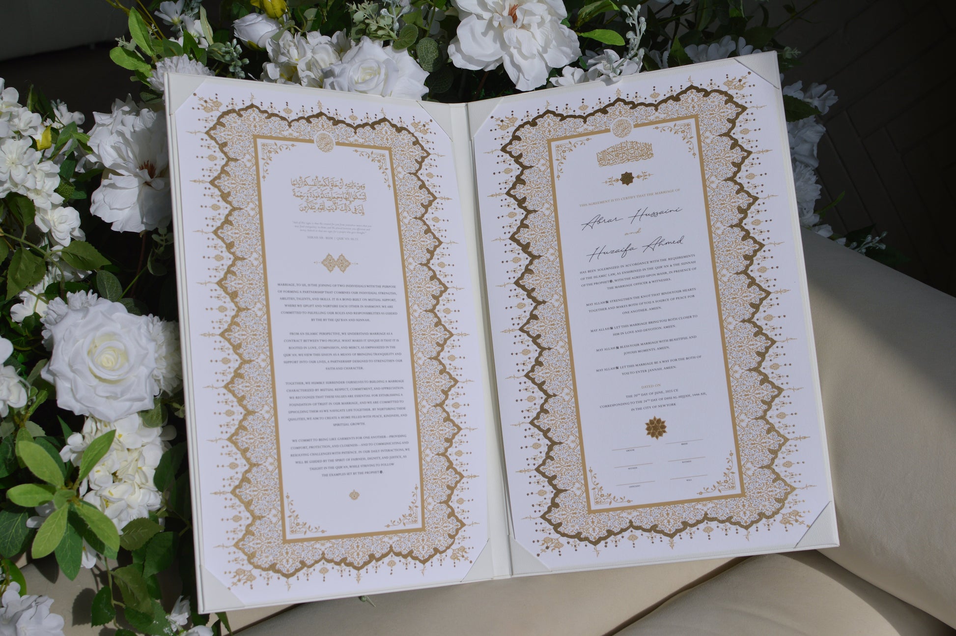 ✦ Two-Page Nikah Certificate with Hand-Painted Gold Embellishments on Both Pages (Choose from  Soraya, Ruqaiya, or Shireen designs)