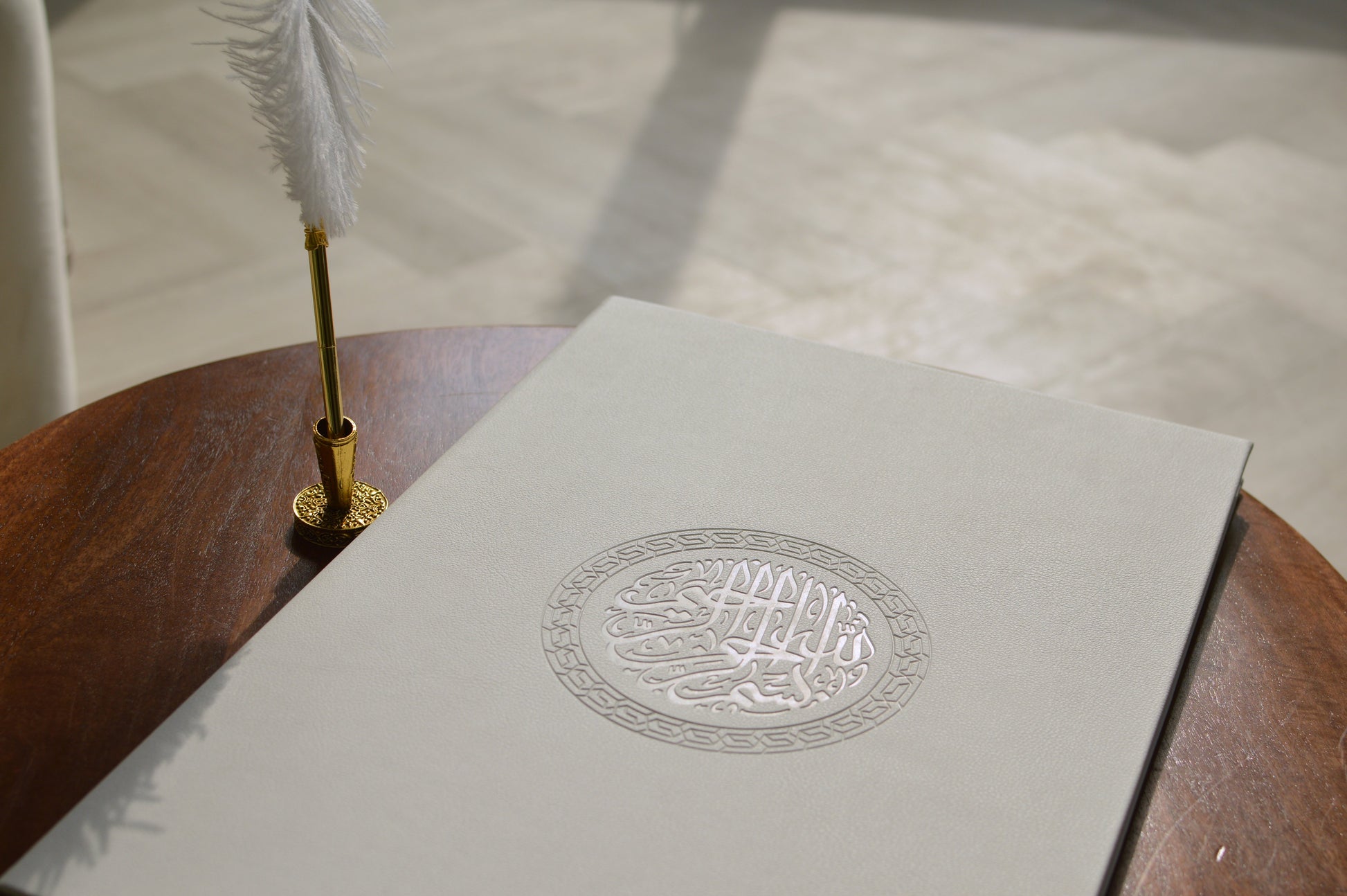 The couple’s crest is a unique emblem exclusive to Raeesa Studio nikah certificates and wedding products. Our calligrapher will create a beautiful crest featuring the groom and bride's first names in Arabic.