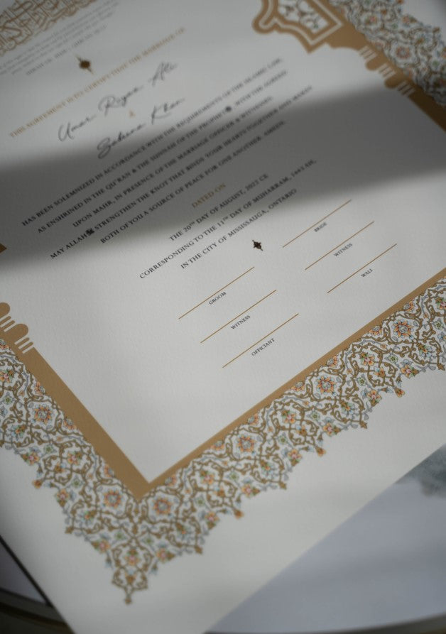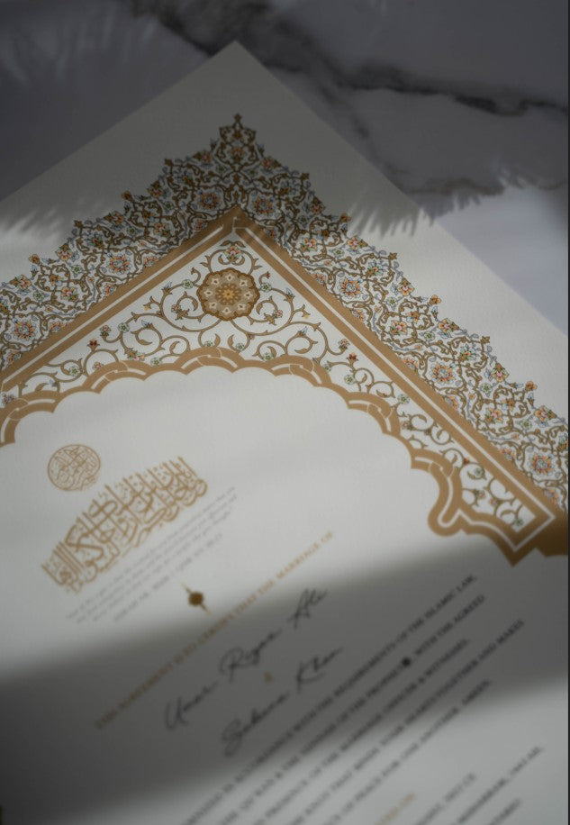 Yes. Raeesa Studio nikah certificates hold Islamic validity as Muslim marriage contracts provided that the Mahr is stated on the certificate. You have the flexibility to personalize the Mahr directly on our website once you have selected your preferred design.