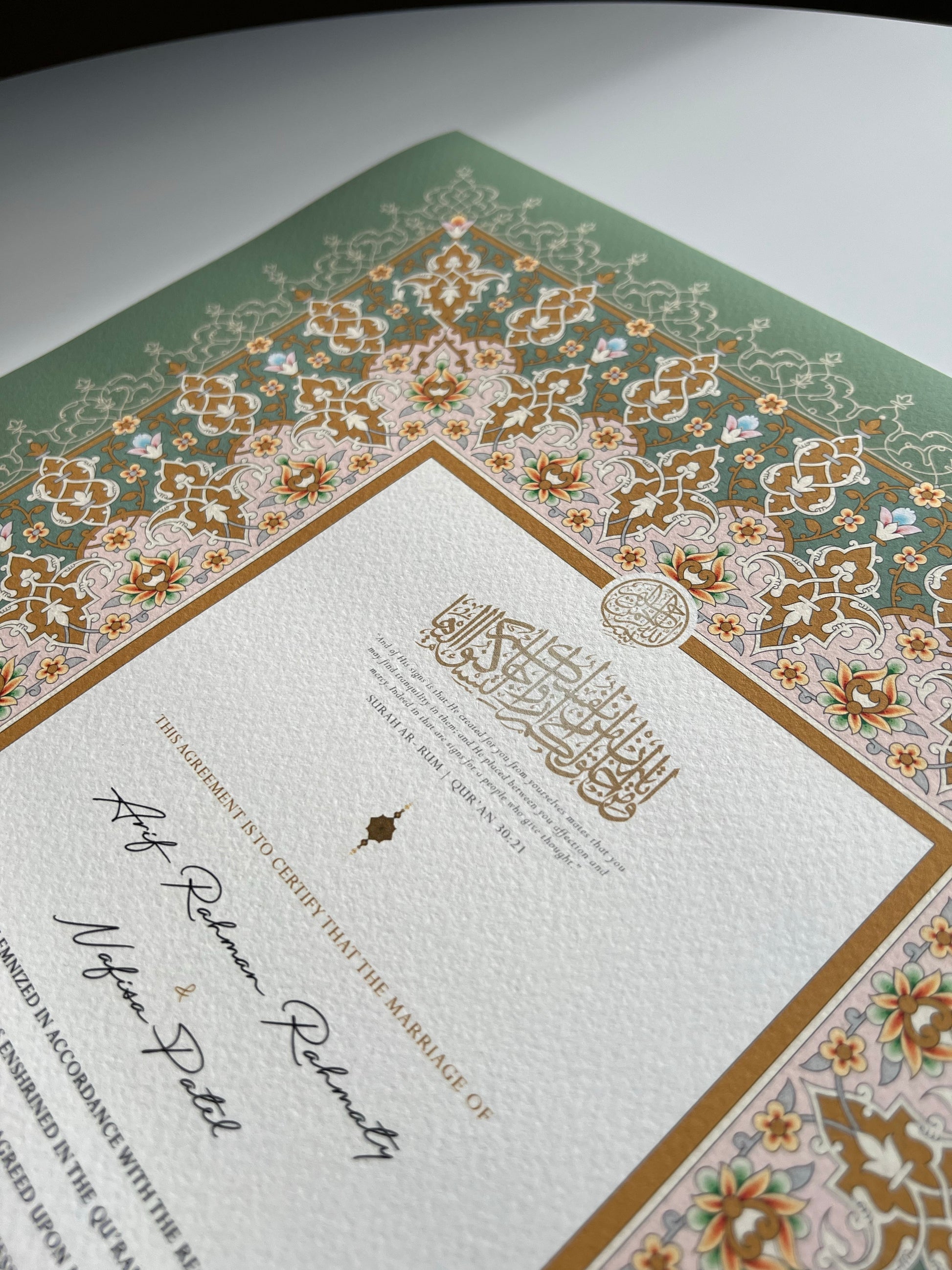 View our certificate text here. Raeesa Studio nikah certificate texts have been approved by Islamic scholars and are applicable to all sects. All certificates include hand-composed Arabic calligraphy of the basmala with Surah Ar-Rum and translation at the top.