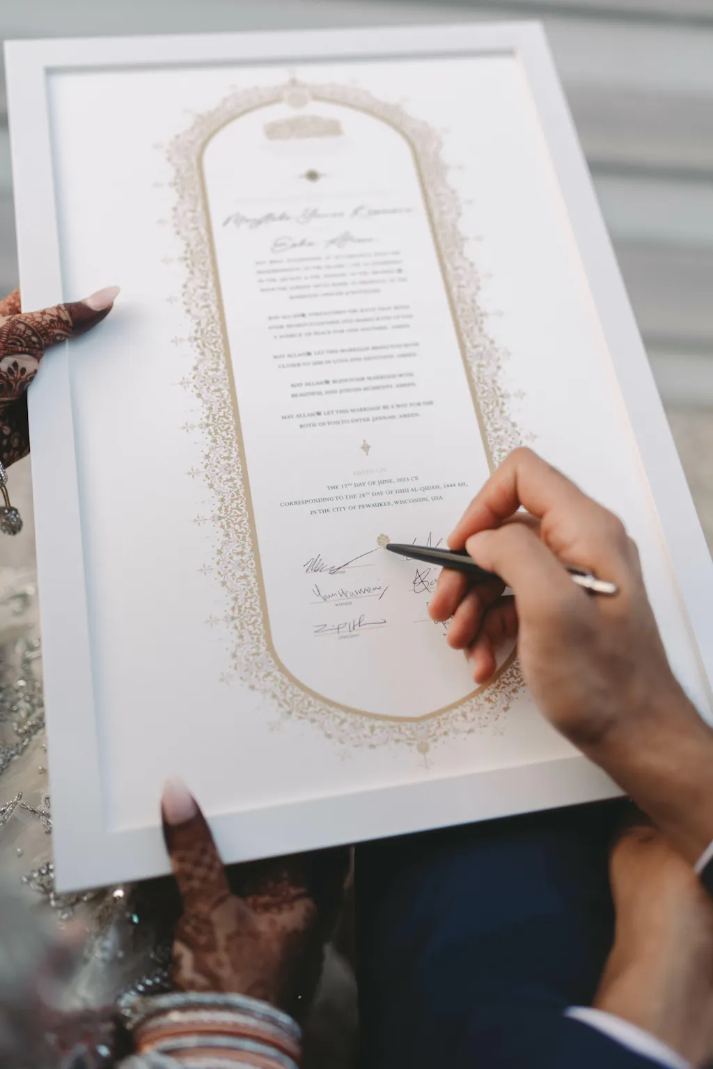 Raeesa Studio nikah contracts have been evaluated by recognized marriage officiants in Canada. These certificates have been signed by numerous couples worldwide, including those in the United States of America, the United Kingdom, Australia, and various European and Asian countries, at their nikah ceremonies.