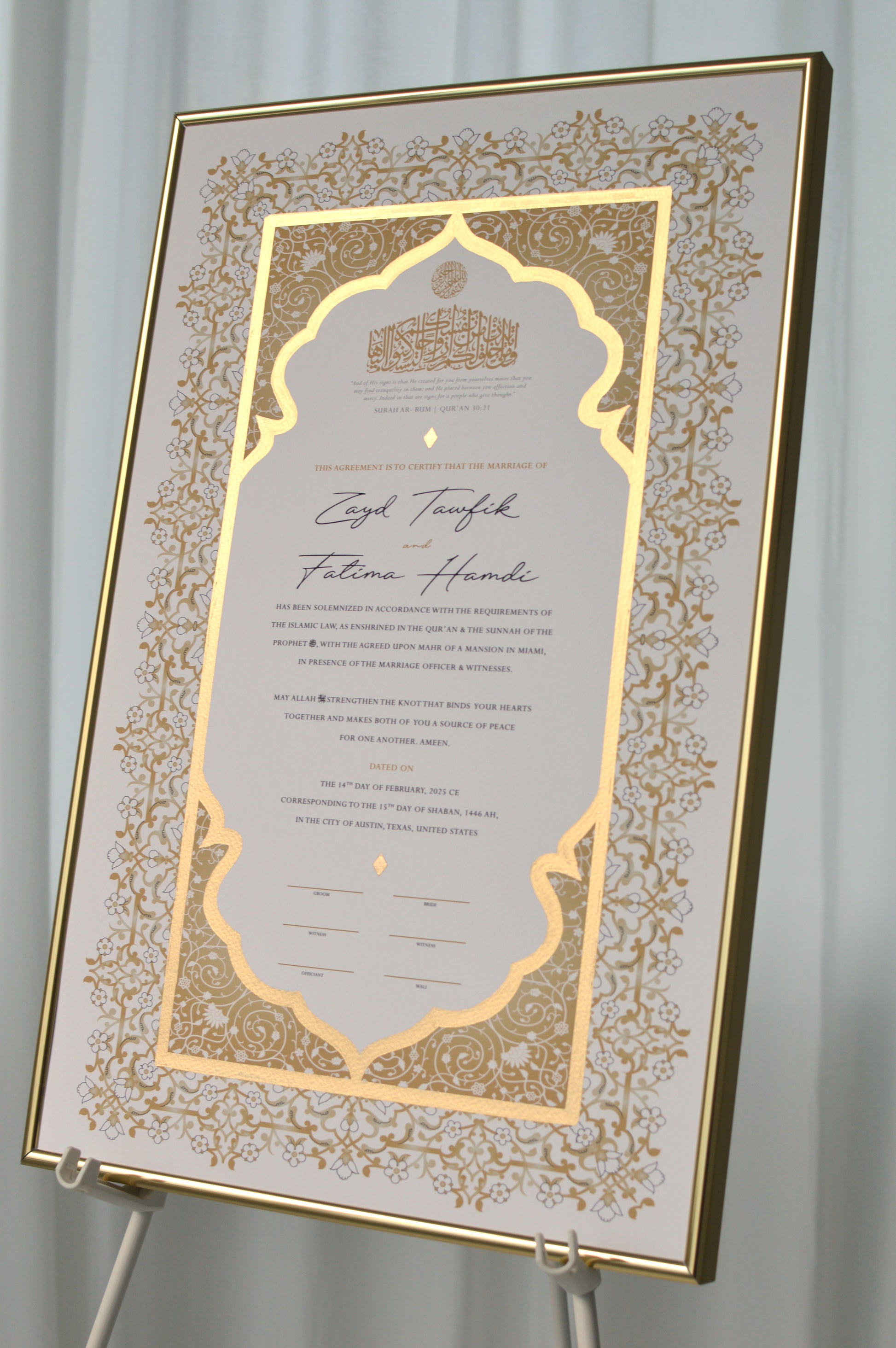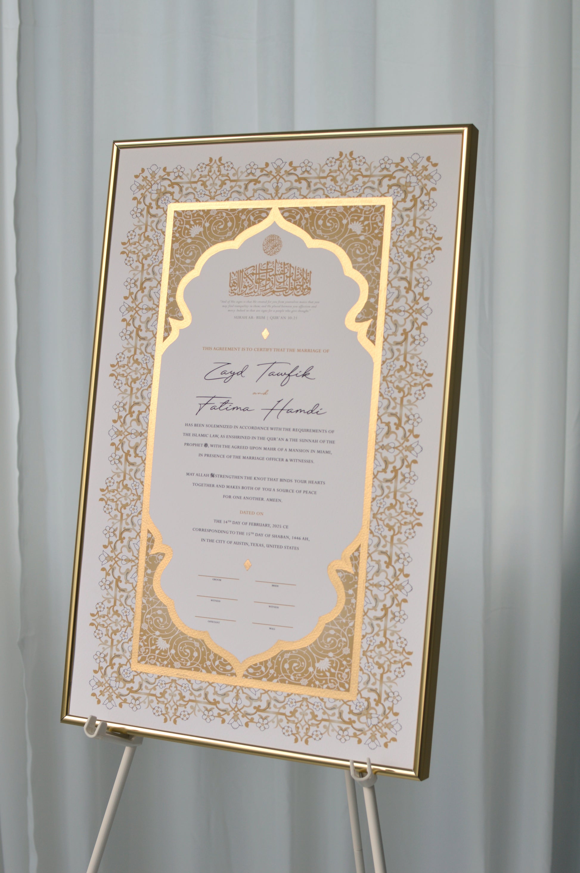 With delicate white flowers and gold arches on the top and bottom, this bespoke contract was originally crafted as a custom design for a bride seeking versatility and seamlessly complements any classic nikah decor.