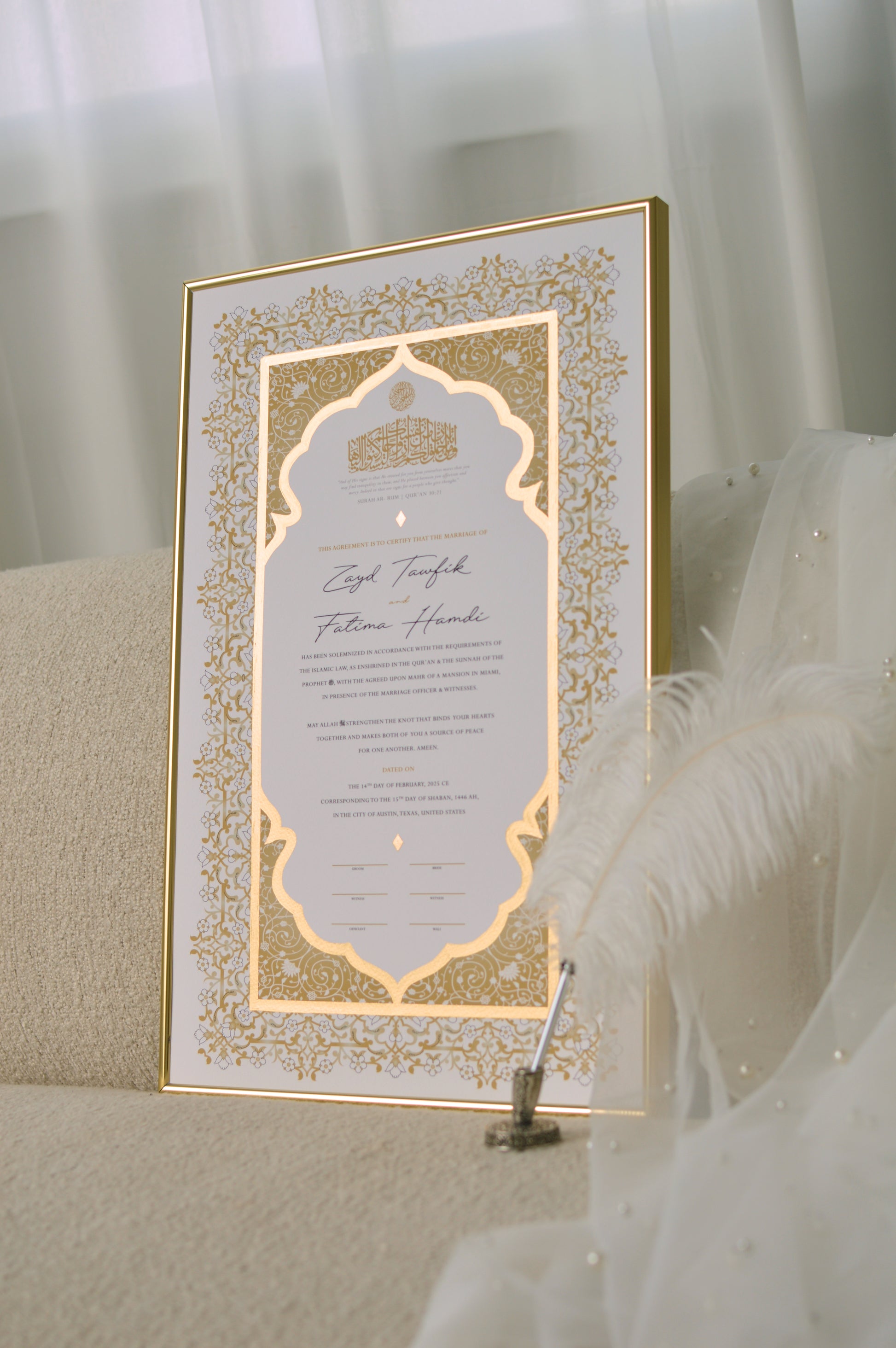Yes. Raeesa Studio nikah certificates hold Islamic validity as Muslim marriage contracts provided that the Mahr is stated on the certificate. You have the flexibility to personalize the Mahr directly on our website once you have selected your preferred design.