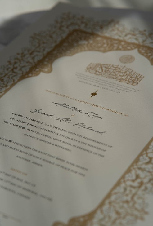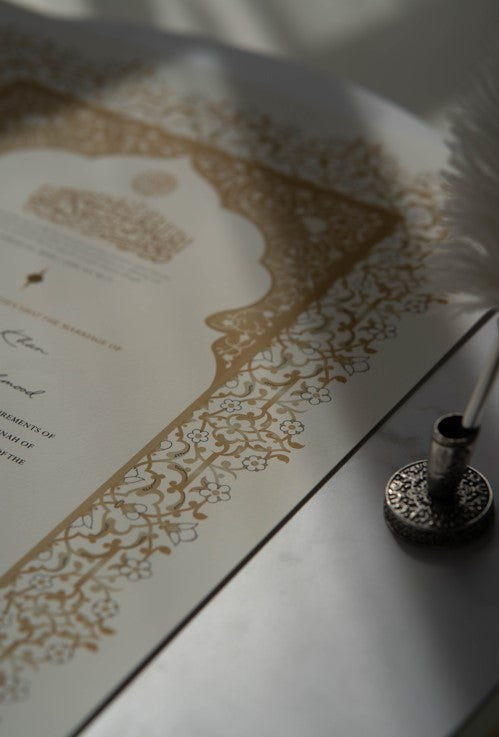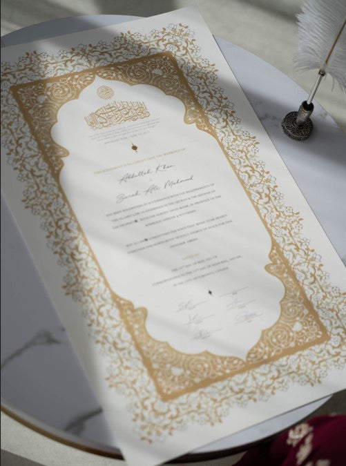 Yes. Raeesa Studio nikah certificates hold Islamic validity as Muslim marriage contracts provided that the Mahr is stated on the certificate. You have the flexibility to personalize the Mahr directly on our website once you have selected your preferred design.