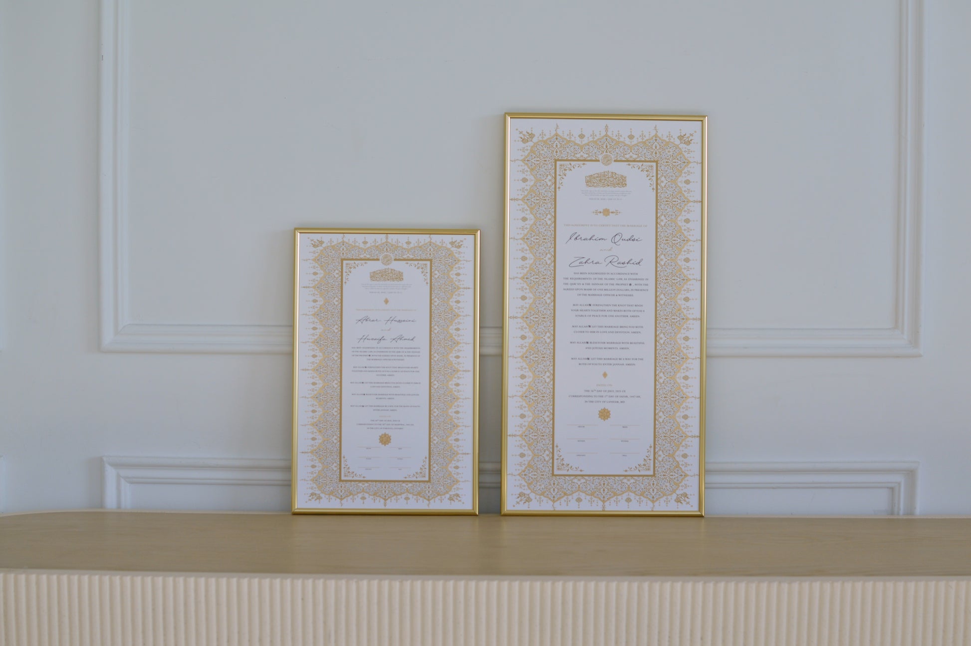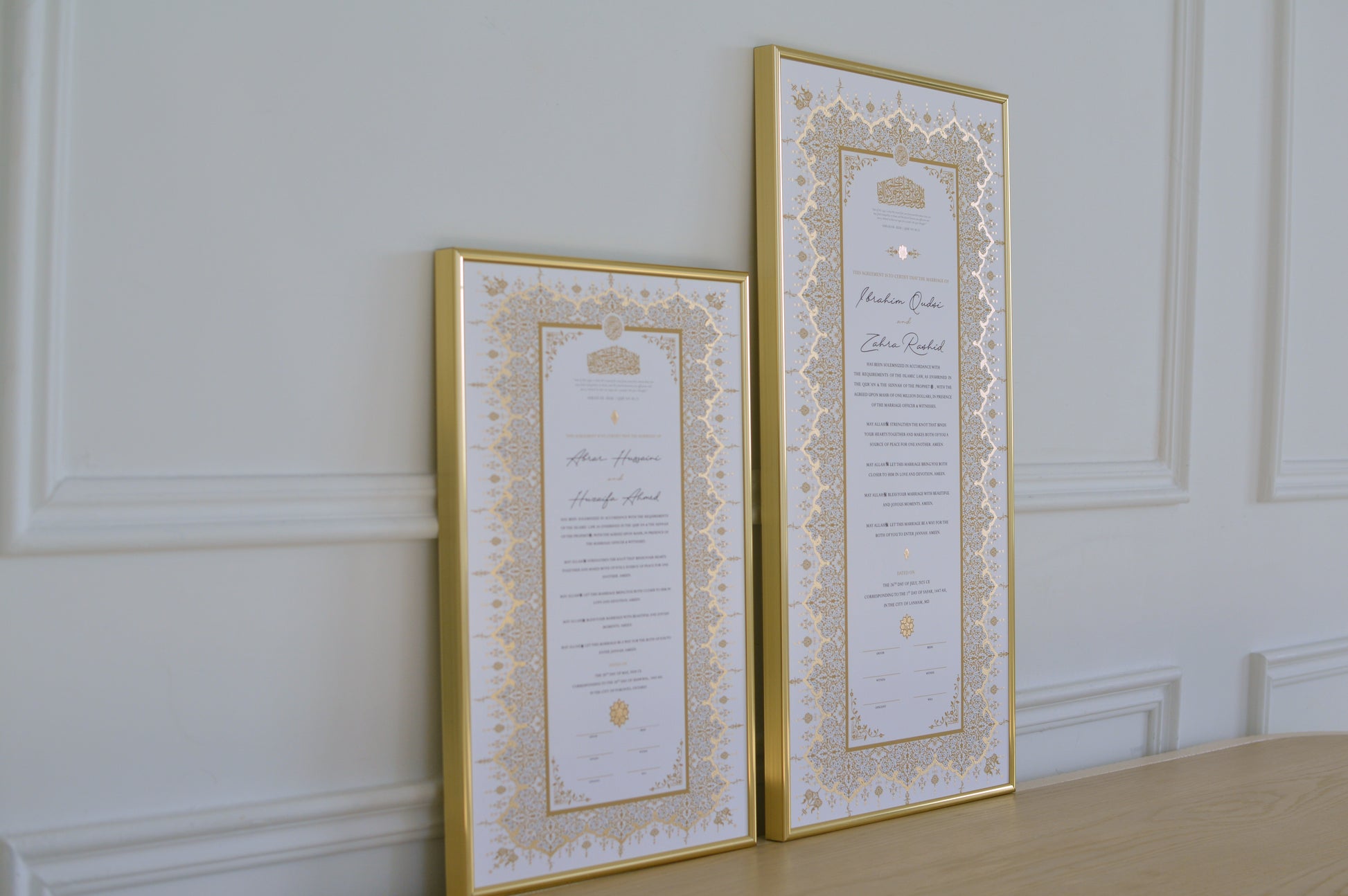 Yes. Raeesa Studio nikah certificates hold Islamic validity as Muslim marriage contracts provided that the Mahr is stated on the certificate. You have the flexibility to personalize the Mahr directly on our website once you have selected your preferred design.